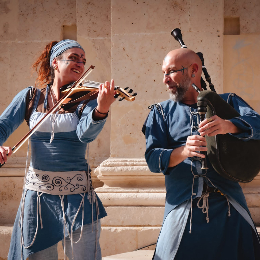 Suivez-nous dans une époque où les instruments d'antan résonnaient dans les cours des châteaux. Avec des sonorités de luth, de vielle à roue, de flûtes et de percussions médiévales, cette troupe captivante recrée l'ambiance festive et joyeuse des festivités médiévales. Passages : les mercredis, jeudis et vendredis à 10h, 12h15, 14h et 18h; les samedis et dimanches à 10h, 12h30, 14h et 18h